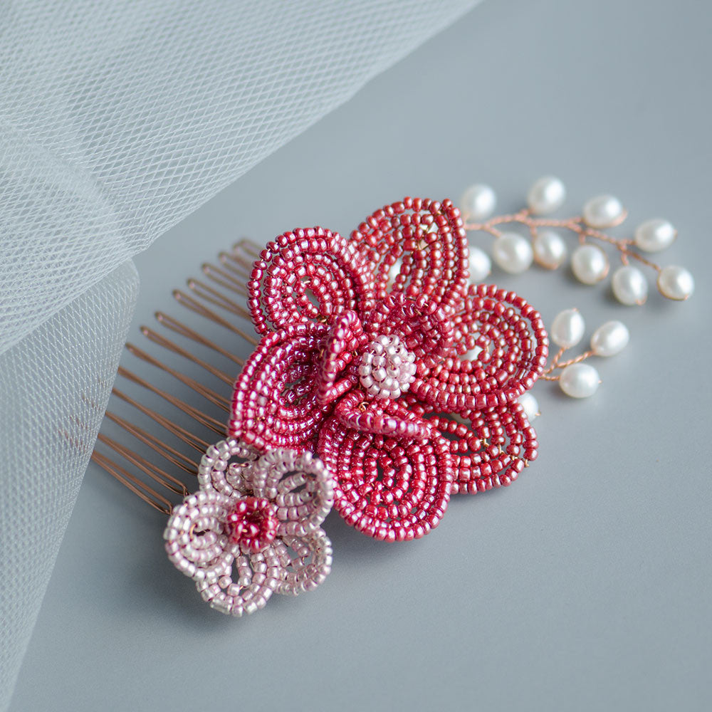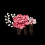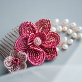 Introducing our stunning French Beaded Flowers Hair Accessories in Red and Pink with rose gold tones, ideal for Chinese weddings. This bridal headpiece combines French beading and traditional Millinery techniques for a unique design. The playful contrast of large and small flowers, accented with two natural pearl twigs, creates a harmonious balance. This versatile headpiece complements a variety of hairstyles and is a perfect match for Chinese wedding gowns or warm-colored dresses.