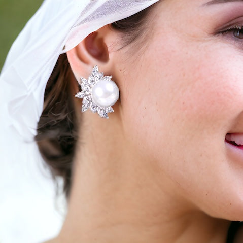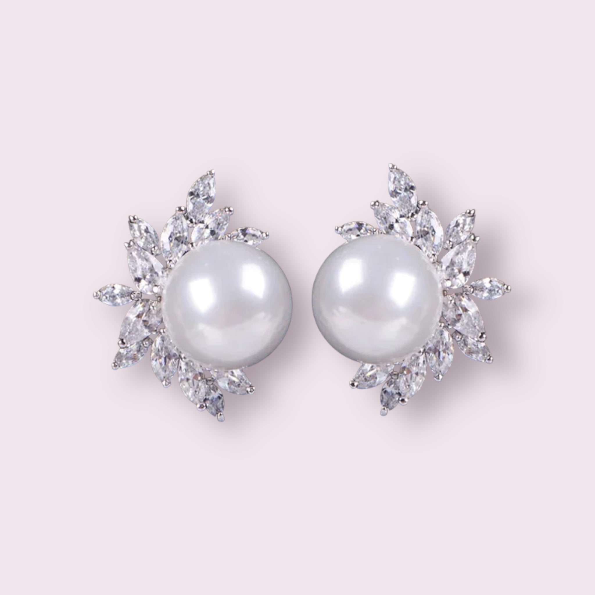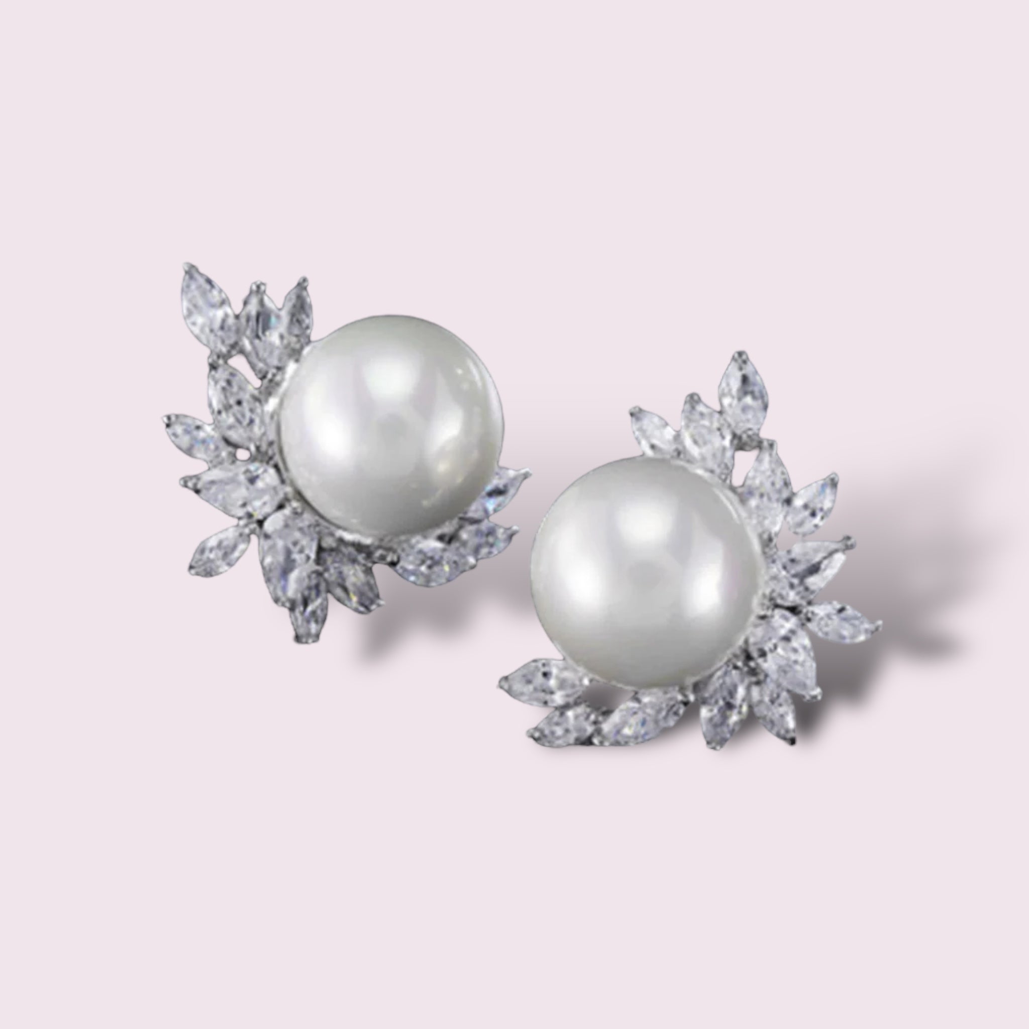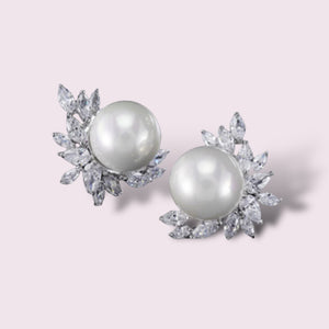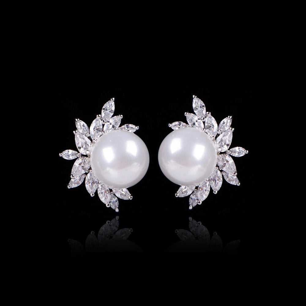 materials: round simulated pearl, AAA cubic zirconia, white gold (Rhodium) plated, copper, lead free cadmium free
